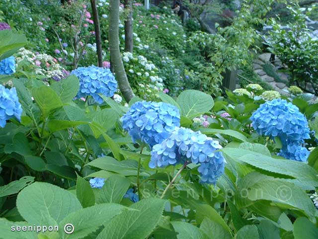Hydrangea - Hydrangea flowers. Kamakura, Yokohama. Hydrangea is one of the very famous flowers in Japan that blooms in May or with the beginning of rainy season. There are dozens of different colors (white, blue, purple) and shapes of hydrangea, which is native to East Asia, North and South America. |