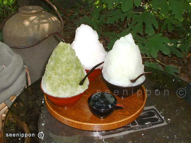 Kakigiri - This syrup-flavored shaved ice is a popular desert and also a fun-food in summer time Japan. Similar cold deserts are popular in other Asian countries too, but Japan kakigori has a wider range of flavors like strawberry, green tea, and plum-alcohol. Some records say the history of kakigori ran to the Heian period (794 – 1185), and gradually became a popular desert among common people. Following the old traditions, very few places in Japan today also use naturally frozen ice to shave for kakigori, instead of commercially produced ice. This photo shows freshly made kakigori made of natural ice in three leavers, plum-alcohol, green tea and sweet beans, and melon. In food stores packed kakigori similar to ice cream is available. In normal market, kakigori price ranges from about US$ 1.5 to 5. date050818 |