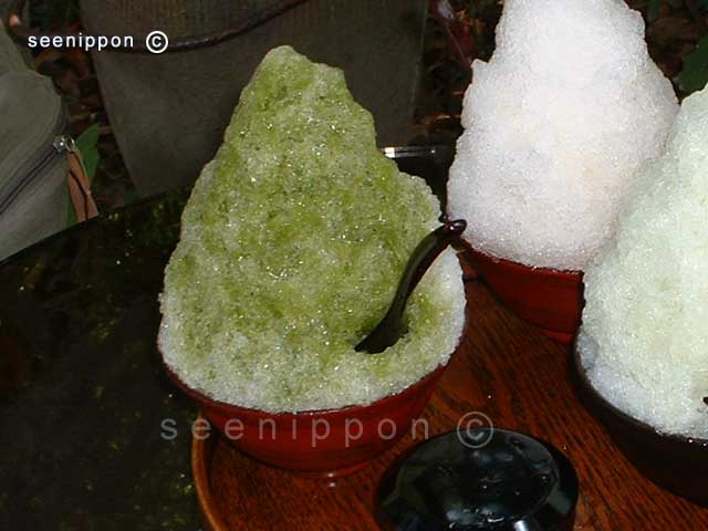 Kakigiri – Green Tea Flavor - This syrup-flavored shaved ice is a popular desert and also a fun-food in summer time Japan. Similar cold deserts are popular in other Asian countries too, but Japan kakigori has a wider range of flavors like strawberry, green tea, and plum-alcohol. Some records say the history of kakigori ran to the Heian period (794 – 1185), and gradually became a popular desert among common people. Following the old traditions, very few places in Japan today also use naturally frozen ice to shave for kakigori, instead of commercially produced ice. This photo shows freshly made kakigori made of natural ice in green tea and sweet beans flavor.. In food stores packed kakigori similar to ice cream is available. In normal market, kakigori price ranges from US$ 1.5 to 5. date050826 |