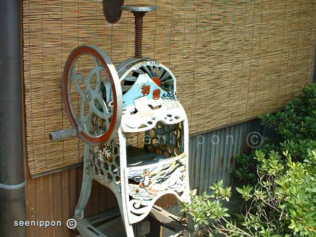 Kakigori machine - The device to shave ice or kakigori machine must have a long history, same as to kakigori (shaved ice desert). With the industrial developments, almost all commercial machines converted into electric, but still some old hand cracked machine can be seen. This old machine with decorations of Mt. Fuji and the raising sun found in Saitama Prefecture, but it's not in use now. In the use, block of ice fixed into the machine and gradually shave by rotating the hand wheel. In modern shops, small hand cracked machines can be seen for home use. Kakigori is a desert made of syrup-flavored shaved ice and highly popular in summer time Japan. date050827 |